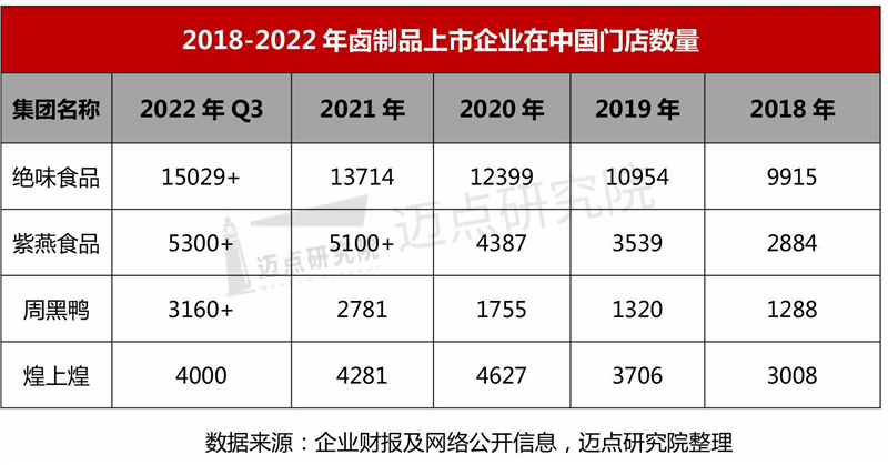 从门店规模上来看,紫燕食品虽然上市较晚,规模小于绝味食品,但已经高于周黑鸭和煌上煌。目前,紫燕百味鸡目前的门店数量已经超过5300家,遍布全国180多个城市;煌上煌在财报中称,由于部分门店亏损和关店数量增加。截至2022年三季度,门店已缩减至近4000家。而绝味食品并没有要放缓开店步伐。截至2021年末,绝味食品中国大陆地区门店总数达13714家(不含港澳台及海外市场),全年净增长1315家。据招商证券调研反馈,今年前三季度绝味食品净增门店约1300家,共计门店数超过15029家。