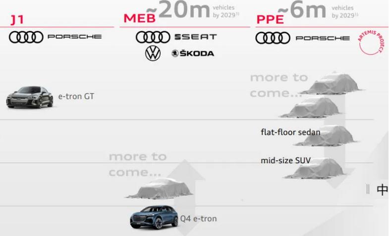 目前奥迪在3个平台下规划了纯电动产品,J1平台下的e-tronGT、MEB平台下的Q4e-tron等,以及基于PPE平台打造的A6 e-tron和Q6 e-tron系列。