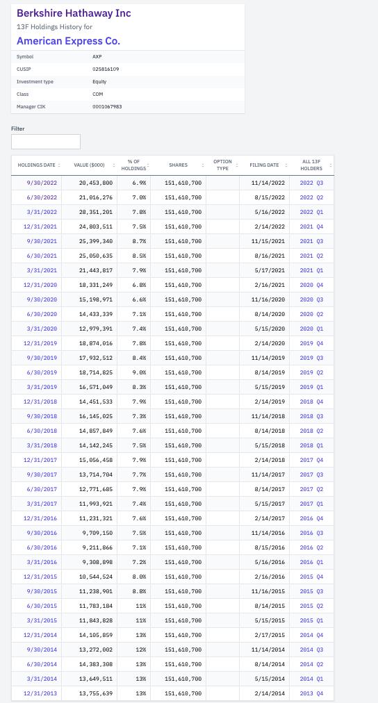 值得注意的是,伯克希尔自1990年代末以来就没有买卖过美国运通的股份,受到股票回购影响,其持股比例从2002年的11%稳步攀升至约20%,1994年至今巴菲特长期持有美国运通29年。