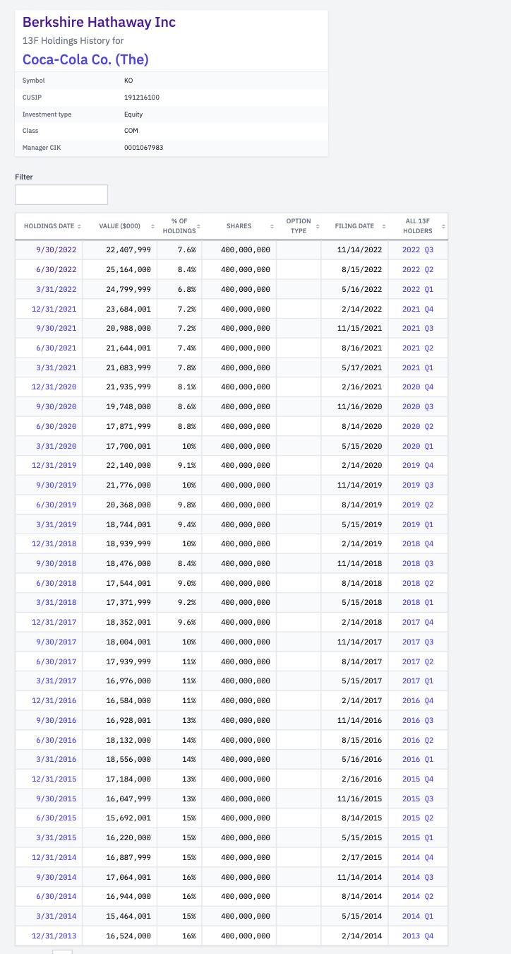 巴菲特长期持有的投资理念在可口可乐上也得以体现。他在1988年首次购买了5亿美元的可口可乐,在1989年又买进了4亿美元,1994年又增持了4个亿美元,总共投入了13亿美元。1988年以来即使可口可乐股价涨幅超过2400%,巴菲特赚得盆满钵满,他都没卖过1股。
