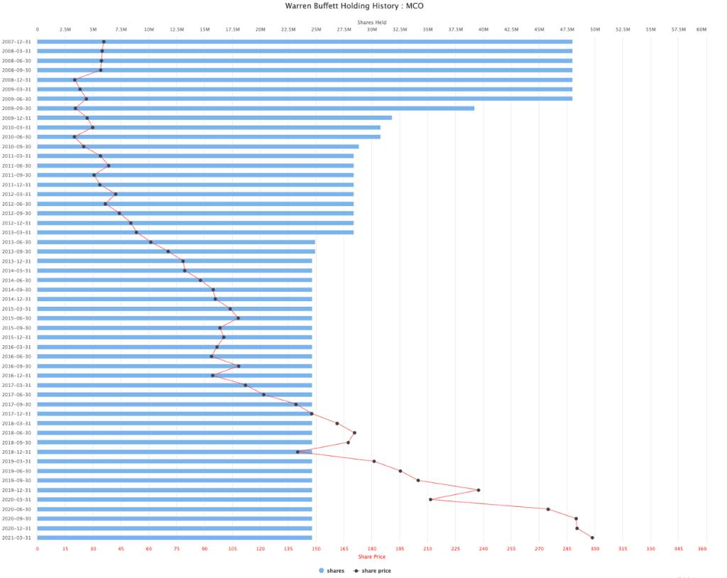 伯克希尔曾是信用评级和数据分析公司穆迪的长期投资者,自2000年买入穆迪股票,在2009年最高峰时持有4800万股,2009年7月首次减持其在穆迪的股份,之后即使股价回升,巴菲特仍继续出售股票,直到2013年中后出售才停止,但也不再买入穆迪股票。