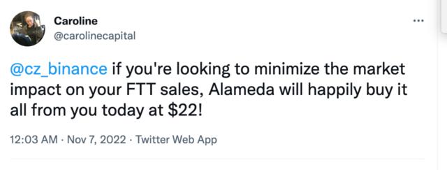 而在11月7日,听闻赵长鹏要抛售2300万枚FTT后,Ellison立刻表示愿意花22美元/币的价格回购,瞬间点燃了市场对于这件事的关注,加速了FTX集团的消亡,而这也是Ellison在公开场合最后一次发声。