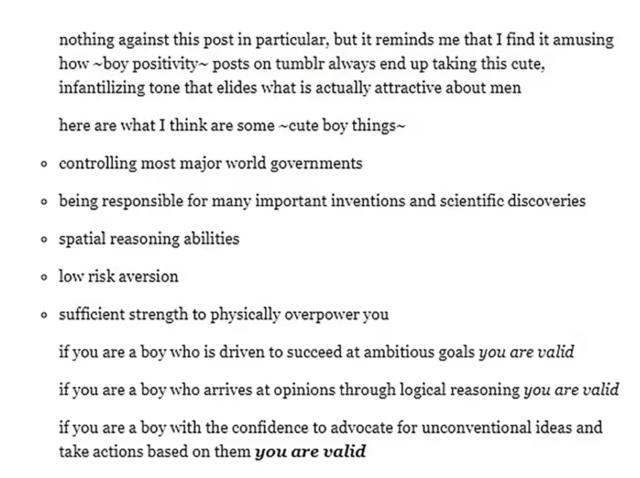 除了在社交平台上分享了自己的情感状态的变化,Ellison还列了一份“可爱男生特征”清单,这些特征包括“控制世界上大多数主要政府”,“足以压倒你的力量”和“对于低风险的厌恶”等等。