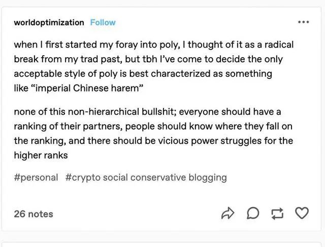 Ellison在社交网络平台Tumblr中将这“不一般的亲密关系 ”比作“中国封建帝王的后宫”,她说自己正沉浸于“一夫多妻”的感情状态中,每个人都有似后宫般“等级森严”排位,她写道: