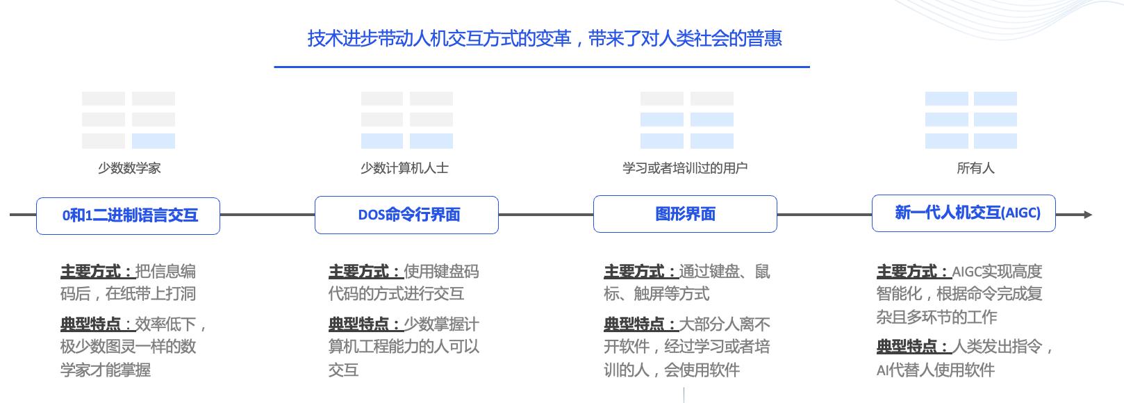 从技术发展的视角来看,尚晏仪将人机交互的发展阶段分为四步。“在历史上,一旦技术积累达到拐点,由人类‘懒’的本质带动的交互界面迁移是必然发生的。这是一个迅速且不可逆的进程。”