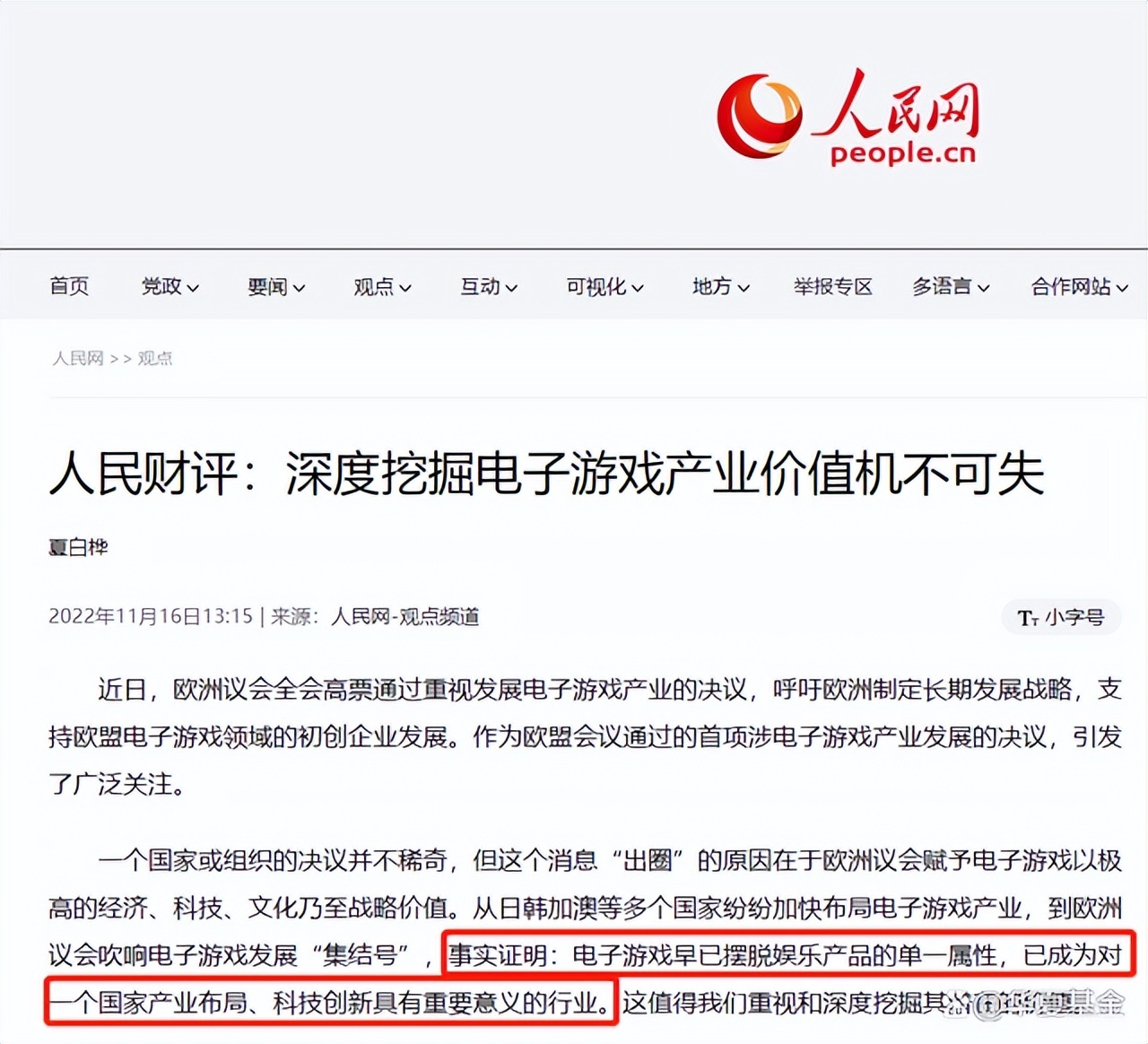 近日,人民网发表评论,深度挖掘电子游戏产业价值机不可失。欧洲议会也通过了重视发展电子游戏产业的决议,支持欧盟游戏企业发展。