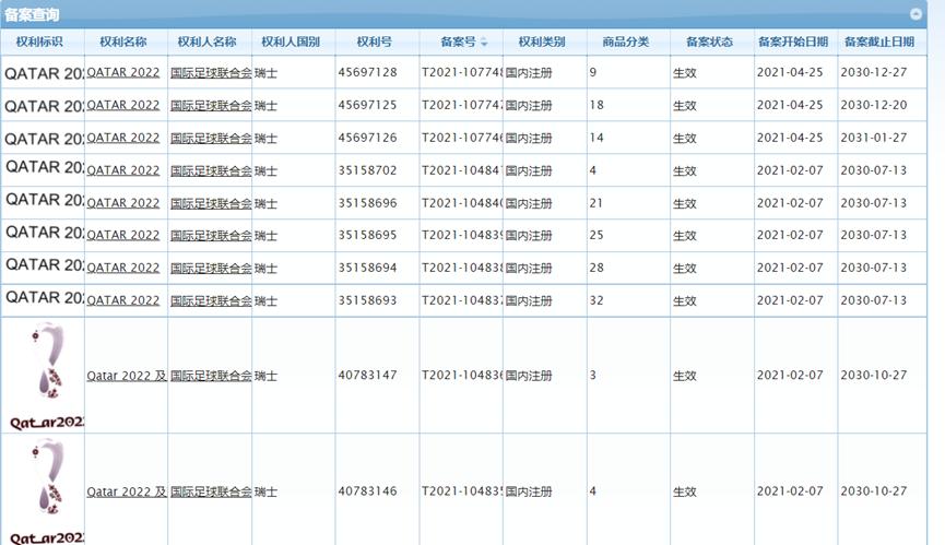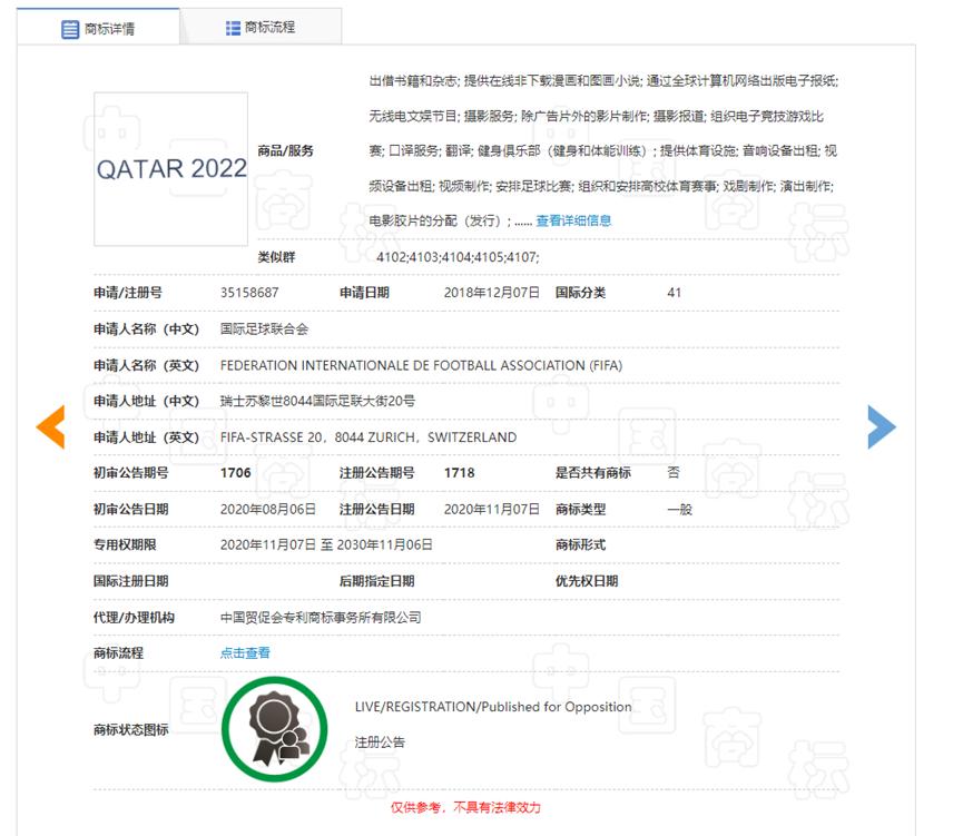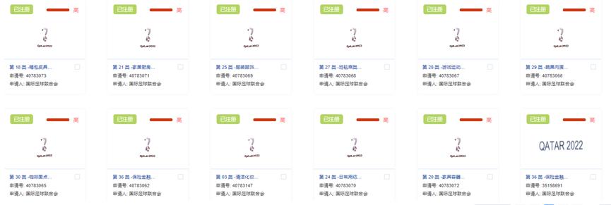 每一届世界杯的举办地一旦公布,就会有无数商家闻风而至,试图以抢注商标的方式谋取利益,殊不知国际足联早有防备。足球巨星梅西曾说,“历史对我紧追不舍,但我的速度更快”,国际足联申请注册商标也是如此。如下图所示,国际足联早就于2018年就开始在我国申请注册本届卡塔尔世界杯的核心标识“QATAR 2022”。