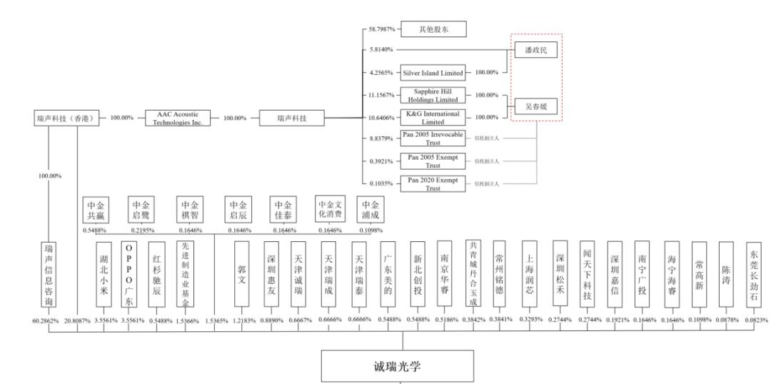 瑞声科技通过全资子公司瑞声信息咨询和瑞声科技(香港)合计持有诚瑞光学81.1%股权,两者实控人相一致,均为潘政民和吴春媛夫妇。