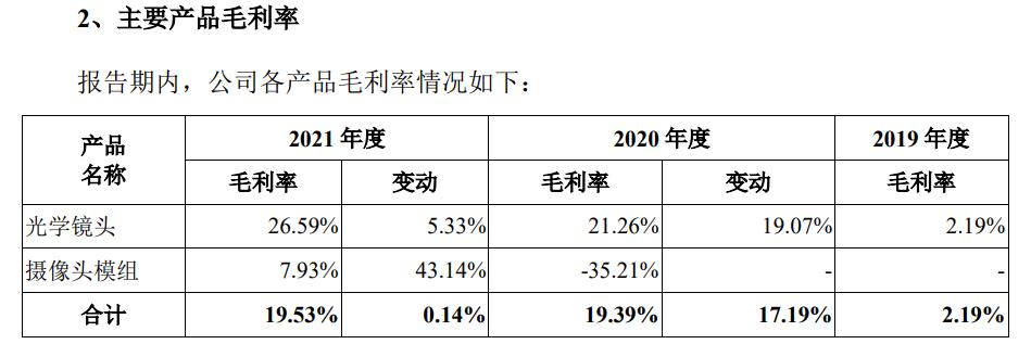毛利率方面,2019年至2021年,公司主营业务毛利率分别为2.19%、19.39%和19.53%,其中,作为公司主要收入来源的光学镜头产品毛利率由2019年的2.19%提升至2021年的26.59%。