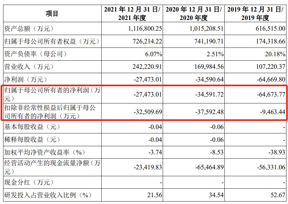 招股书显示:光学镜头和摄像头模组是诚瑞光学的主要收入来源。2019年至2021年,诚瑞光学分别实现营业收入10.7亿、17亿和24.2亿,三年复合增长率高达50.3%。不过,公司目前仍处于亏损状态。