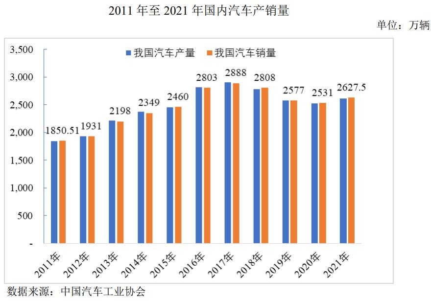 市场规模来看,汽车内饰件市场需求主要由汽车产销量决定。资料显示2011年至2017年,我国汽车产销量呈现快速上升趋势,2017年产销量达到顶峰的2888万辆,此后稍有回落。2020年受新冠疫情影响,产销量稍有下滑,截至2021年,汽车产销量有所回升,汽车零部件市场也有所回暖。