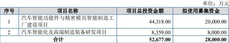 IPO募资方面,本次公司拟募资2.8亿元,资金将用于汽车智能功能件与精密模具智能制造工厂建设项目、汽车智能化及高端制造装备研发项目等。项目建成投产后,将提升公司“做专做精汽车智能功能件”战略发展的需求,进一步满足市场需求。