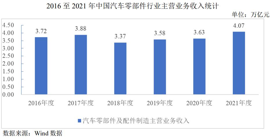 随着我国自主品牌汽车产销量不断扩大,汽车产业链细分汽车零部件行业也实现高速发展,行业规模得到了飞速提升。根据Wind数据显示,2016年至2021年,我国汽车零部件行业主营业务收入已从3.72万亿增长至4.07万亿元。