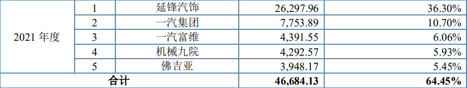下游客户方面,2021年公司前五大客户分别是延锋汽饰、一汽集团、一汽富维、机械九院、佛吉亚。