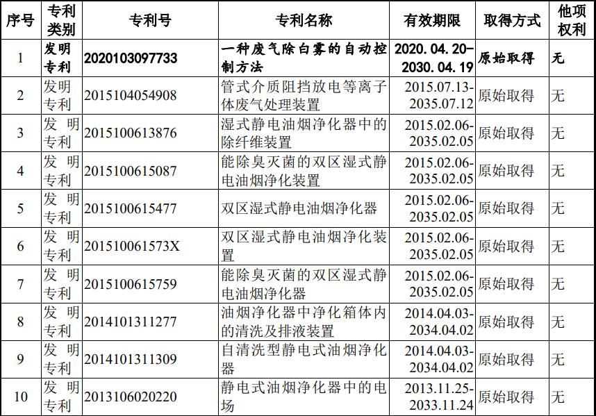 公司高度重视技术积累和研发创新,目前已形成了以静电式油烟废气治理技术为核心的技术体系,并利用自身技术优势在行业内形成了较强的竞争力。截至2022 年6月30日,公司共拥有122项专利,其中发明专利22项、外观设计专利41项、实用新型专利59项。