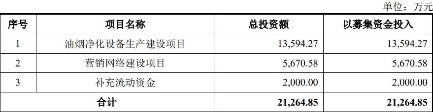 IPO募资方面,本次公司拟募资2.12亿元,资金将用于油烟净化设备生产建设项目、营销网络建设项目、补充流动资金等。项目建成投产后,将进一步满足油烟净化设备行业持续增长的市场需求,不断提升公司的经营效益。