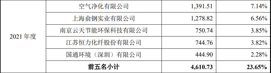 客户方面,2021年公司前五大客户分别是空气净化有限公司、上海俞钢实业有限公司、南京云天节能环保科技有限公司、江苏恒力化纤股份有限公司、国通环境(深圳)有限公司。
