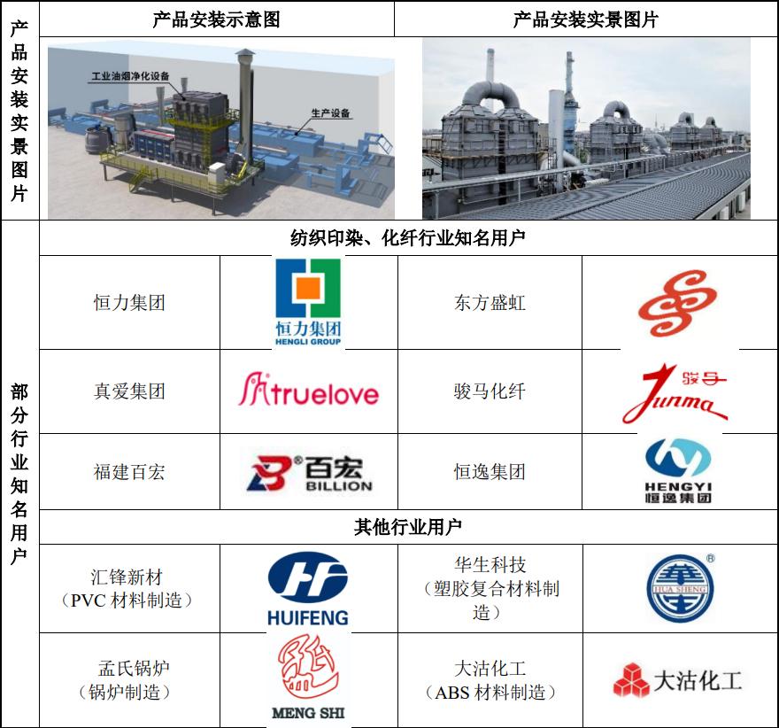 公司自成立以来,一直专注于研发、制造和应用高效、稳定、安全的静电式油烟 废气治理设备。目前,公司的静电式商用油烟净化设备客户主要为商业综合体、连锁及社会餐饮、酒店、学校、企事业单位食堂等餐饮用户,静电式工业油烟净化设备客户主要为纺织印染、化纤、PVC、橡塑材料制造等工业用户。
