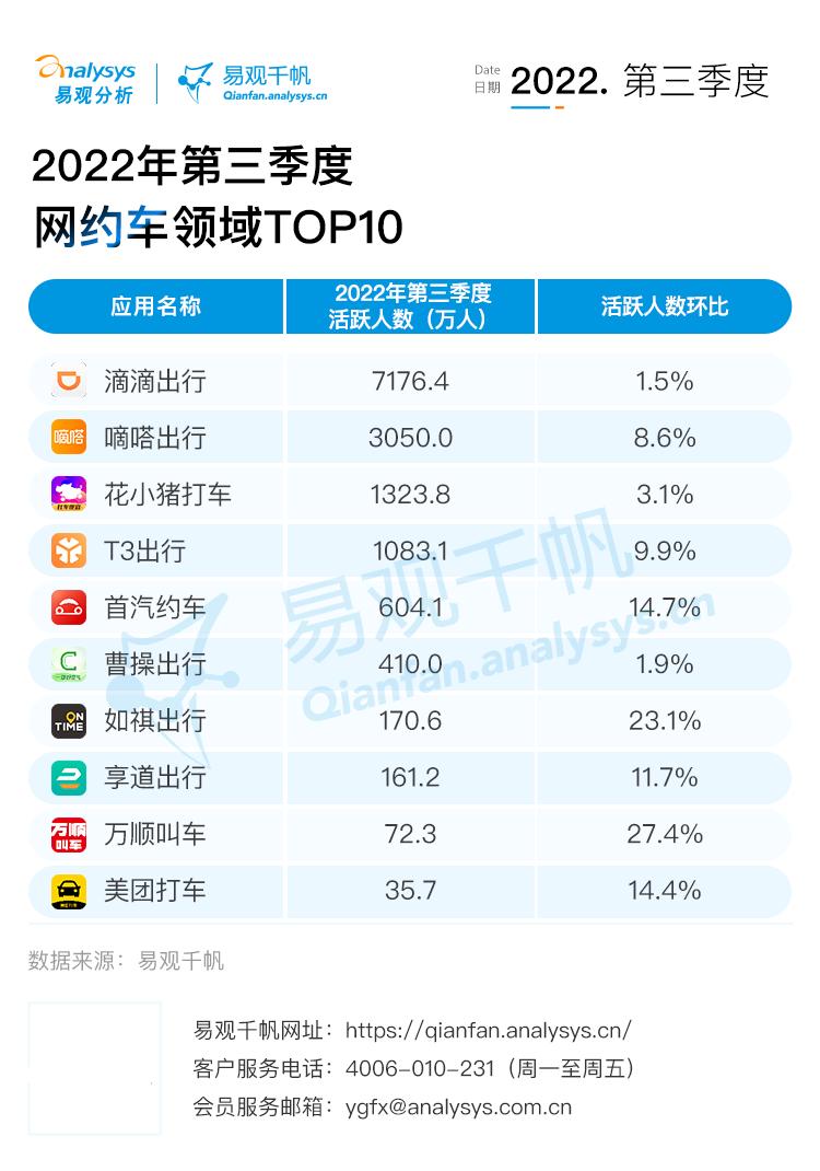 网约车合规化进程持续推进,网约车平台正在向管理规范化、收费合理化、服务品质化方向发展。其中,滴滴出行凭借出行生态体系维持领先优势,嘀嗒出行凭借强大的出租车网络在用户规模上继续突显优势。万顺叫车、如祺出行、首汽约车通过不断提升服务质量实现季度活跃用户规模的快速增长。