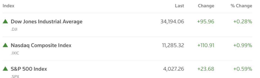 这份充斥着“鸽派”信号的会议纪要公布后,美股三大指数尾盘集体拉升。截至收盘,道指涨95.96点,涨幅为0.28%,报34194.06点;纳指涨110.91点,涨幅为0.99%,报11285.32点;标普500指数涨23.68点,涨幅为0.59%,报4027.26点。