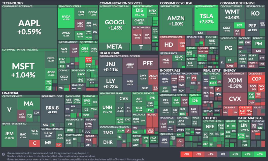 其中,美股科技巨头也集体大涨,亚马逊、奈飞、谷歌、微软涨超1%。特斯拉在周二创52周新低后,于周三大幅反弹7.82%,领涨标普500成分股,市值一天增加420亿美元。