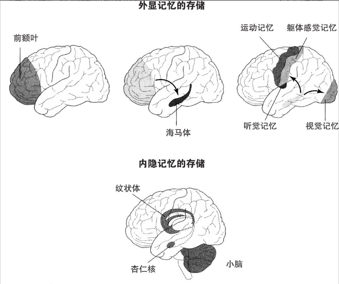 2000 年诺贝尔生理学或医学奖获得者埃里克·坎德尔,研究发现了外显记忆和内隐记忆在大脑中的存储规律,如下图。