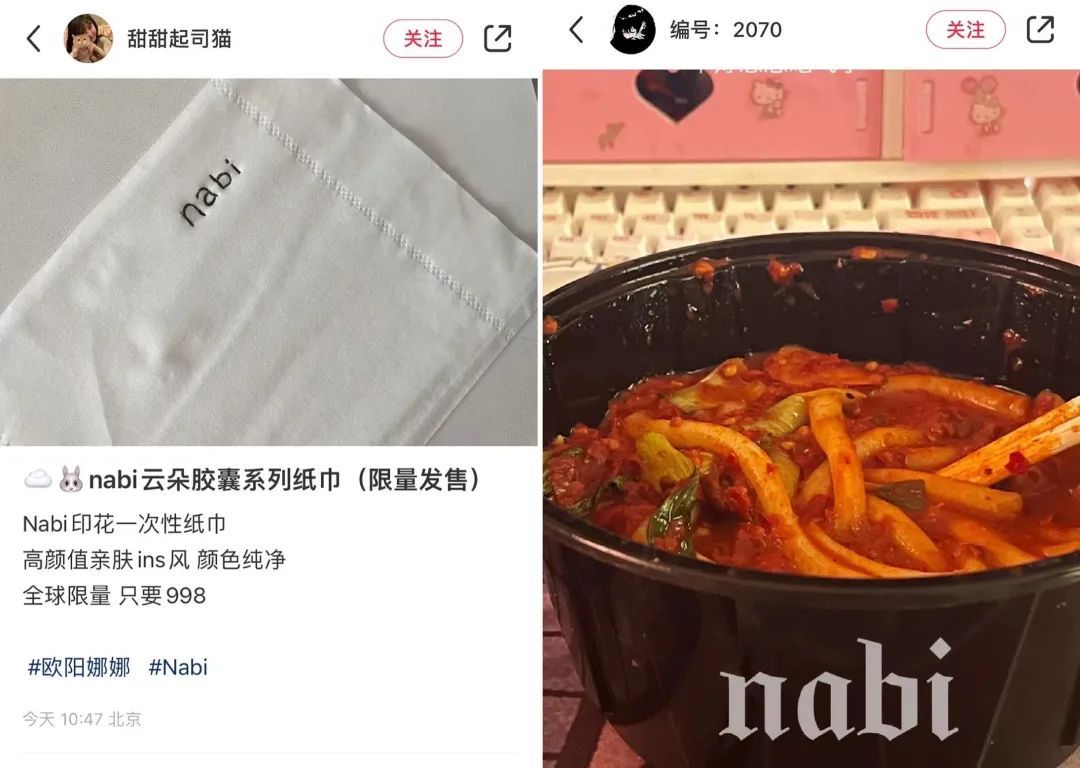 nabi是块砖,哪里需要往哪里搬。有人把它P到新疆炒米粉的外卖盒上,虚构了一个nabi首次跨界联名大企划,被小图唬住点进来的人不少,原来把限量和nabi加在一起能产生以及乱真、说688一碗也能售罄的魔力。