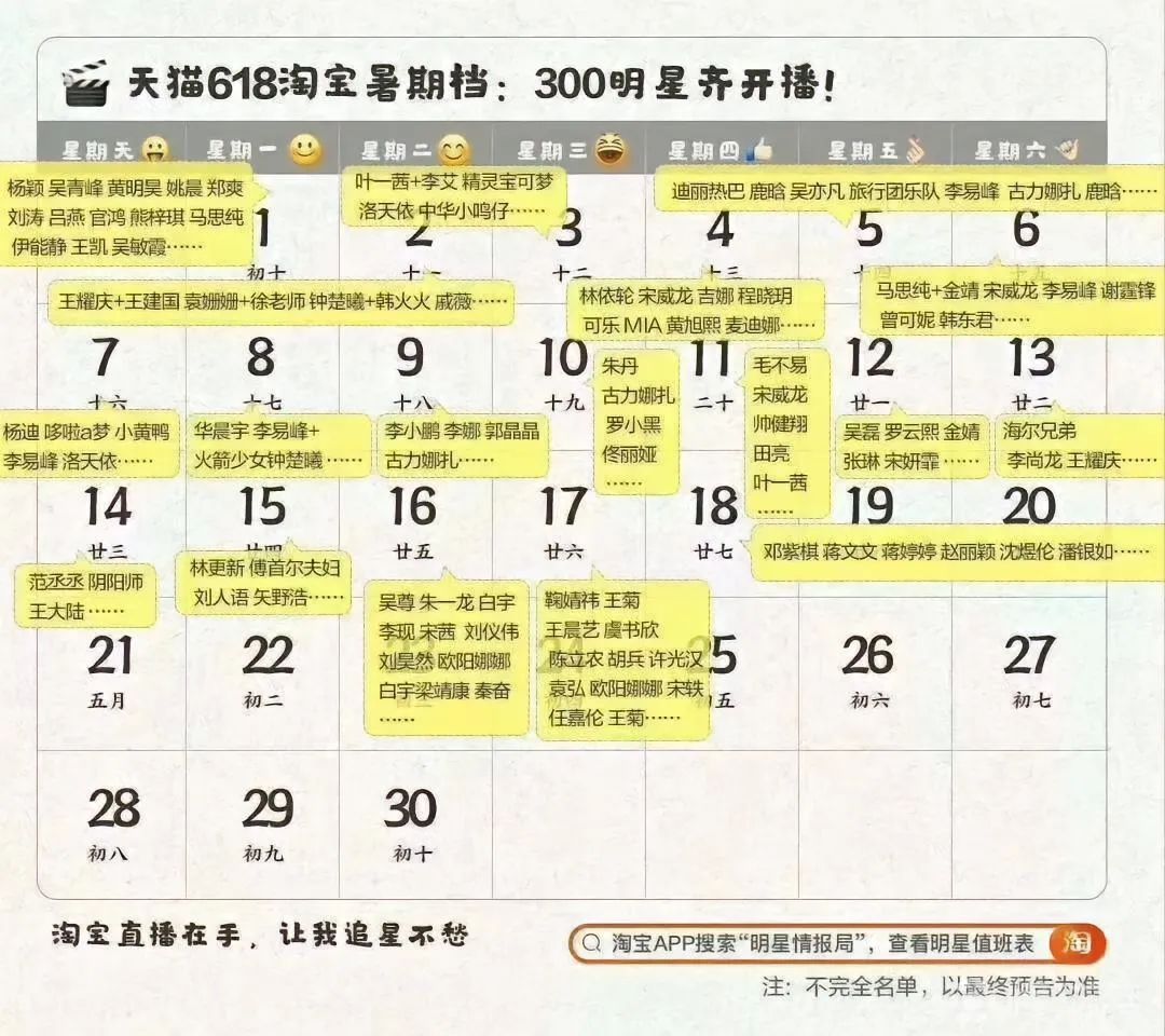 一线明星的示范效应,让直播间成为了明星们的红毯现场。彼时,曾有一张明星赶场淘宝618的图片在朋友圈流传甚广,据不完全统计,618期间,有超过300多位明星走进了直播间。阿里巴巴集团副总裁家洛也曾在节目中透露,2020年,中国演艺界99.5%的明星都走入了直播间。