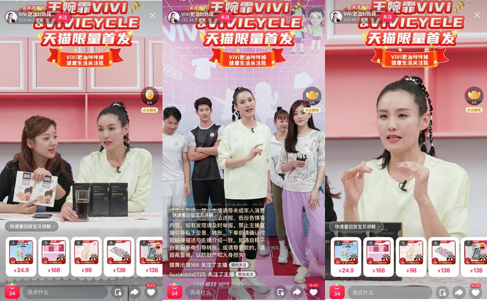 但流量和热度,似乎也没能带来理想销量。10月31日7点,王婉霏进入名为“ViVi肥油咔咔掉”的点淘直播间直播,虽只露面1小时,但据公开数据显示,这日直播的总时长是7小时,但销售额不达百万,随后8天的时间里,点淘的用户不仅没有盼来他们喜爱的刘教练,连ViVi也没再现身。