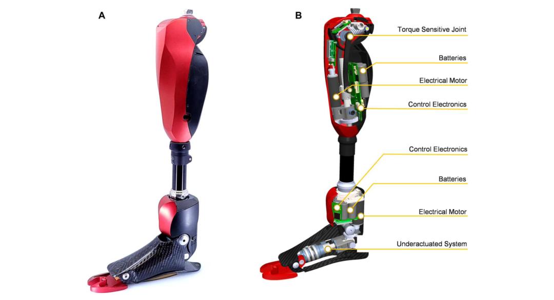 在穿戴者行走过程中,欠驱动系统不仅会再生大量的机械能,也会复制脚踝/足部复合体的关键生物力学功能。而且,所有机械和电气组件都被整合到一个紧凑的假体框架内,增加了仿生腿的鲁棒性和效率。