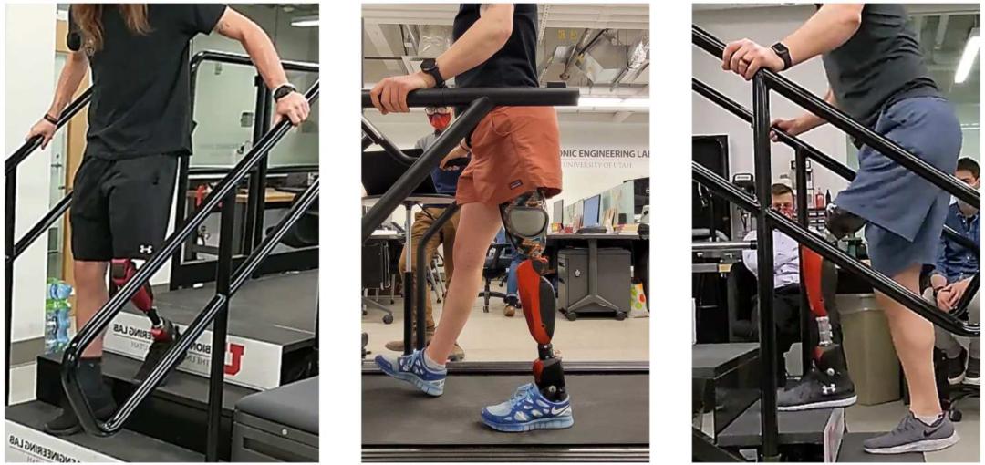 图|三个膝上截肢患者在跑步机上和楼梯上走动。(来源:该论文)