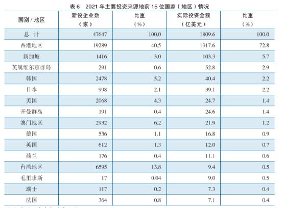 根据商务部发布的《中国外资统计公报2022》,2021年中国主要投资来源地中,香港、新加坡、英属维尔京群岛、韩国的实际投资金额排前四名。