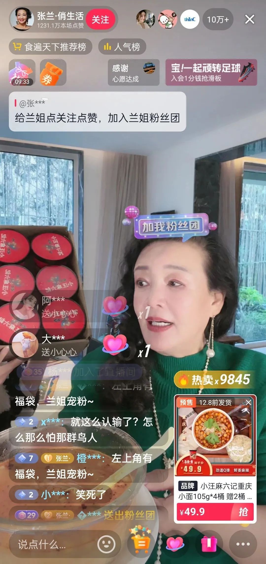 不仅汪小菲,他的母亲俏江南创始人张兰也鼎力相助, 时常能在直播间看到张兰卖力带货,近半个月内直播39场,合每天近3场。即便陷入争议,也不妨碍带货: