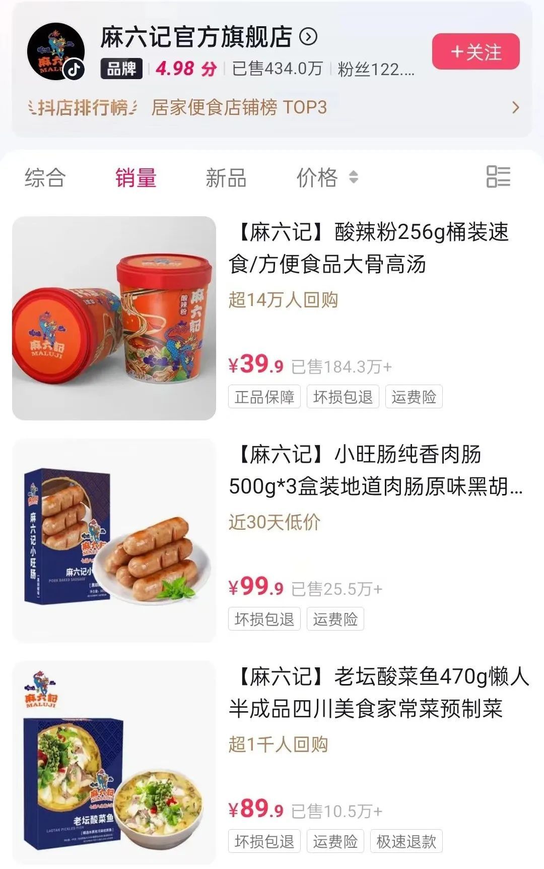 直播间里售卖什么呢?卖得最好的不是堂食套餐或代金券,而是方便速食和预制菜。截至发稿时,麻六记酸辣粉/螺蛳粉销量超过了180万件,位列抖音电商排行榜螺蛳粉爆款榜第一名,且似乎已断货,全部改为预售。
