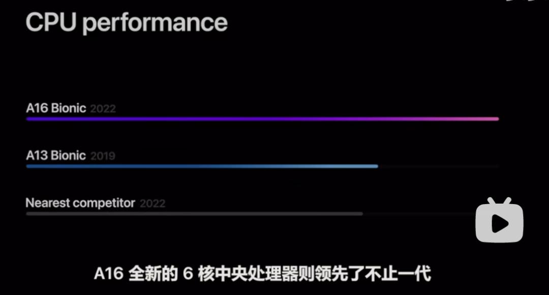 比如,今年新机发布会上,今年的iPhone 14,使用的还是去年发布的A15芯片的增强版;而14 pro所搭载的A16,则由于性能增长过于微弱,苹果干脆将其与2019年发布的A13芯片做起了对比。