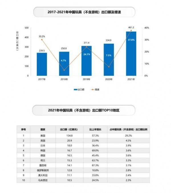 其实这只是中国在玩具生产能力上的一个缩影。从一组数据可以更直观地感受。根据 toyassociation 的数据显示,2021 年美国的玩具市场规模达到 381.9,而美国市场也是中国玩具出口的最主要的目的地,根据《2022 中国玩具和婴童用品行业发展白皮书》中的数据显示,2021 年中国生产的玩具中有将近 1/3 出口到了美国,2021 年中国对美国的玩具出口额也占到美国玩具市场的接近 40%。