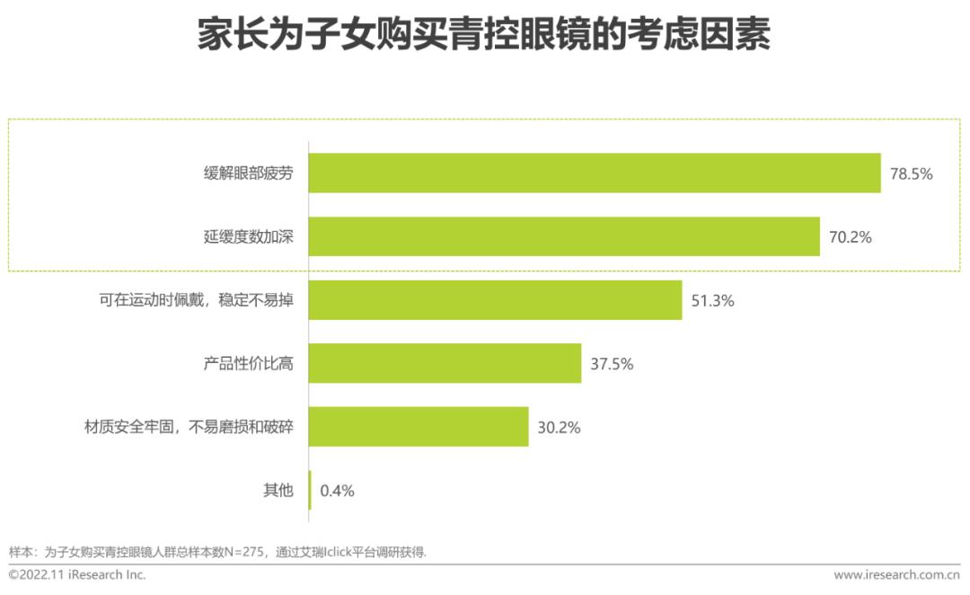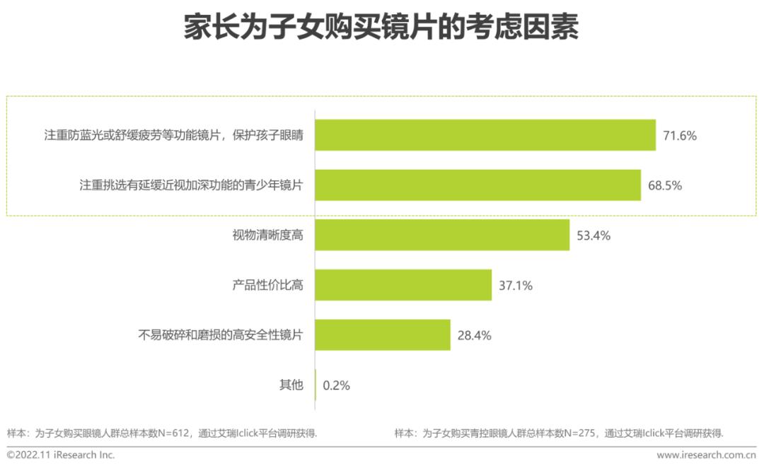 艾瑞调研结果显示,在2063份样本中,有612位家长在近一年内为子女购买过眼镜。家长为子女购买镜片时,首要考虑因素为镜片的防蓝光、舒缓疲劳、可延缓近视加深的功能性,甚至超过了视物清晰度高的需求。这表明镜片产品,尤其是青控产品,核心竞争力开始向增益性功能做衍生,为眼镜产品的差异化发展注入了新的活力。