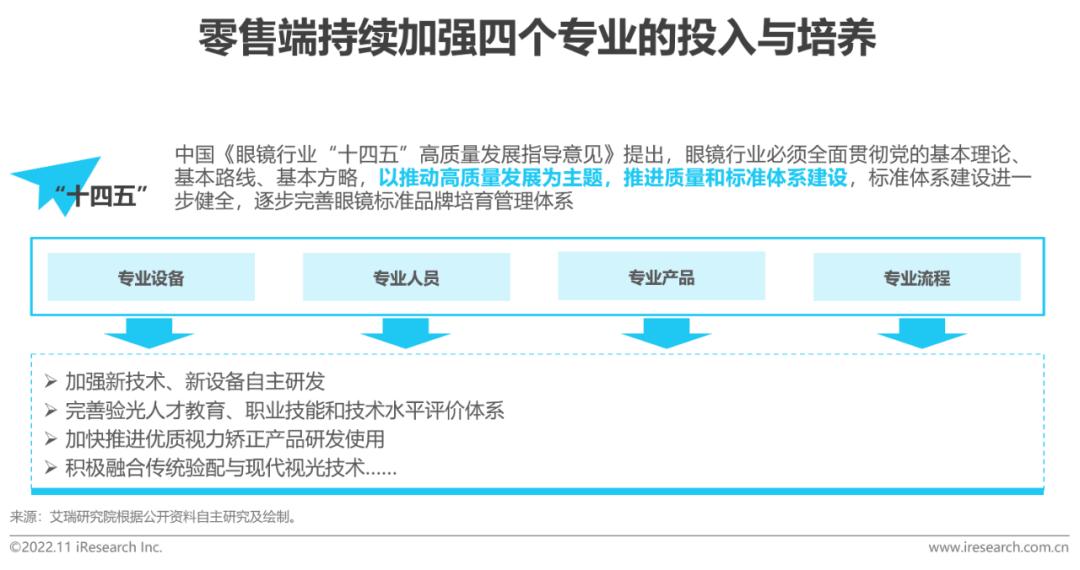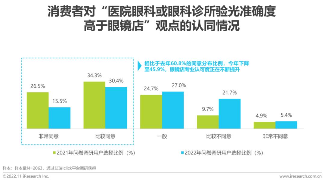 在中国《眼镜行业“十四五”高质量发展指导意见》中,重点提到了眼镜行业质量与标准体系建设的推进,零售端作为消费者配镜的主流渠道,需持续加强四个专业的投入培养,从设备、人员、产品、流程四个维度加强自主研发、人才培养、产品应用、验配视光融合的全套流程体系,以此获得在眼科医院、眼视光诊所的双重压迫和消费者购镜主观意愿发生变化环境下更多的生存空间。据艾瑞调研结果显示,零售端的投入培养正逐步得到正向回馈。相比于去年有60.8%的消费者认为“医院眼科或眼科诊所验光准确度高于眼镜店”,今年仅有45.9%,不到半数的消费者同意此说法,这说明消费者对于零售端眼镜店的专业认可度正在不断提升。