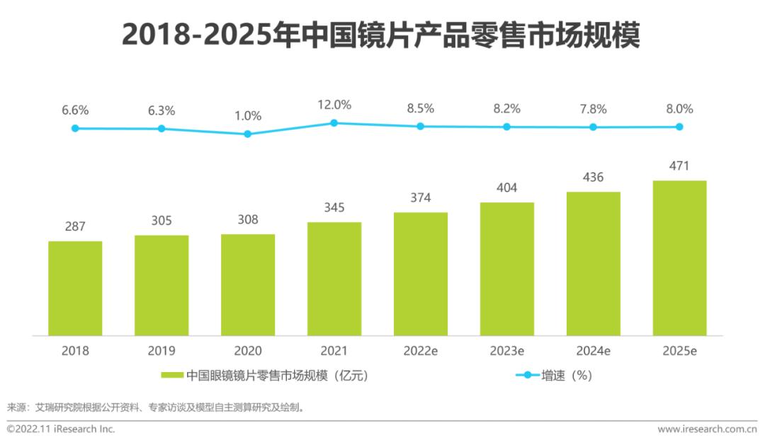 2021年多家头部镜片厂商推出功能性镜片明星产品,此类产品与普通镜片相比客单价更高,加之疫情期间儿童青少年网课时间增加,视力问题集发频发,市场需求旺盛,镜片市场整体呈企稳回升态势,2021年市场规模达345亿元。未来3-5年内,在多功能镜片优化迭代、购买需求回暖及“一人多镜”趋势延续的多元因素影响下,镜片市场规模有望保持中高速增长态势,预计2025年国内镜片零售市场规模将突破470亿元。