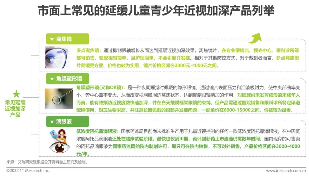 在政府、家长、学校对青少年儿童视力保护日益关注与重视的大环境下,延缓儿童青少年近视加深相关系列产品备受关注,主要包括离焦镜、角膜塑形镜与滴眼液。对比来看,角膜塑形镜可较快延缓近视度数增长程度且无需佩戴框架眼镜,但配镜渠道受限于医院与眼科诊所,对佩戴者的耐受度、眼部卫生保持情况、坚持佩戴效果等均有所要求;滴眼液产品仍处于临床试验阶段,仅以院内制剂形式做少量销售且应用效果反馈较少。而离焦镜由于其产品性价比、配镜渠道便捷性、近视延缓效果反馈的优势特点,快速获得市场关注,迎来了延缓儿童青少年近视加深需求推动下的爆发性增长。