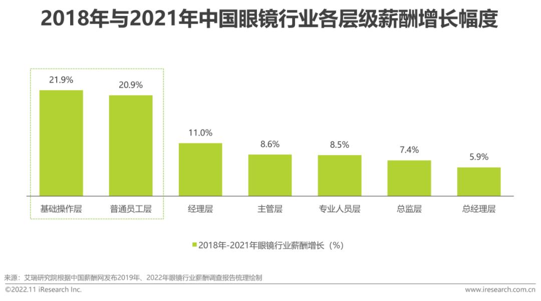 按照国家人社部、国家质检总局、国家统计局联合颁布的《职业分类大典》,中国眼视光技术人才主要有专业技术人员和社会生产服务和生活服务人员两类,从2018年与2021年中国眼镜行业各职级年薪对比情况看,近四年眼镜行业员工薪酬普遍增长,其中普通员工与基础操作员工薪酬涨幅超过20%。同时结合2021年3、4、5月与2021年3、4、5月中国眼镜行业主要原材料大宗商品均价对比情况,树脂镜片、镜架合金原材料价格显著上涨,对眼镜生产厂商侧具有一定生产经营成本压力,在零售端集中表现为眼镜价格上涨。