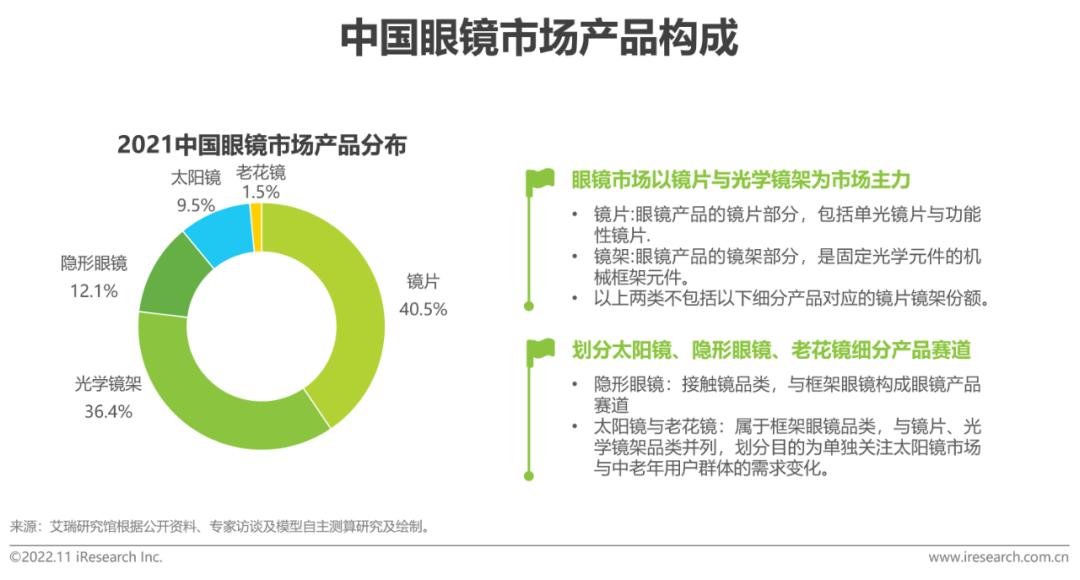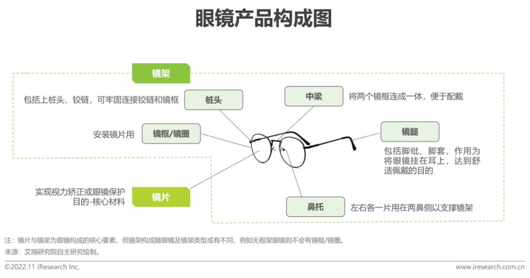 眼镜是用来矫正视力、眼睛保护或作装饰用途的光学器件,主要由镜片和镜架构成。镜片是眼镜功能属性的核心载体,用以实现视力矫正与眼睛保护功能。镜架通常由镜框/镜圈、桩头、中梁、镜腿与鼻托等部分组成,其核心功能与镜片配套构成眼镜,佩戴在面部起支架作用。另外在流行时尚趋势下,镜架带来的美观性、时尚度与脸型修饰功能也更加被人们所重视。本篇报告的研究对象即为眼镜,从眼镜、镜片、镜架三大维度展开,探究中国后疫情时代下眼镜行业的发展环境、产业格局、消费者需求变化等,为产业从业者及终端消费者提供信息参考。