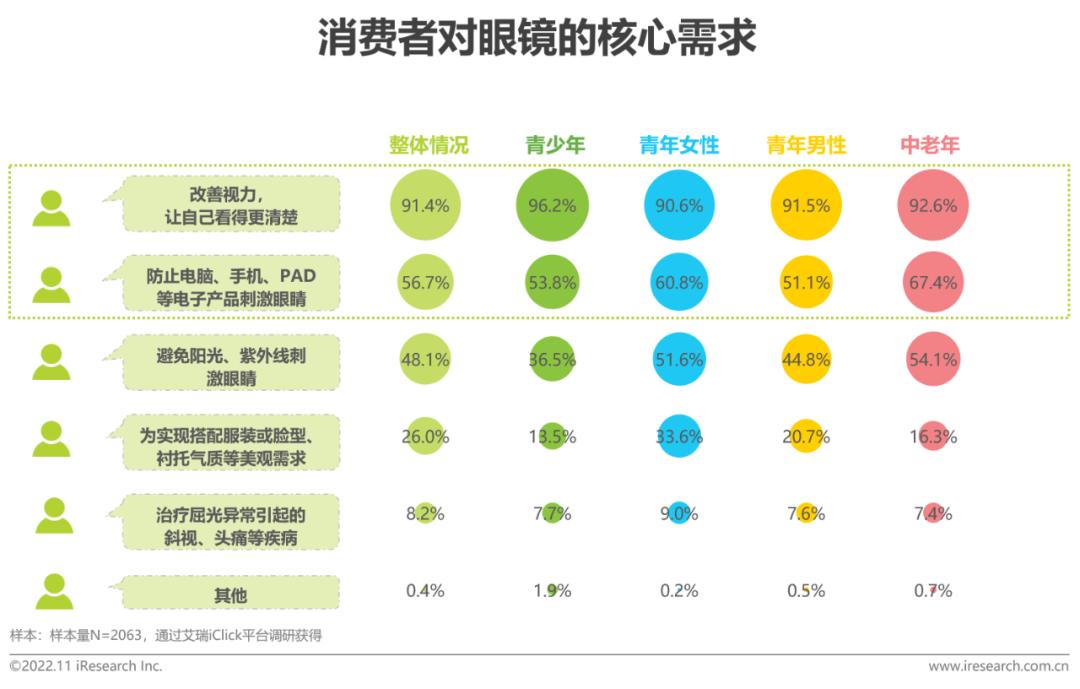 艾瑞调研结果显示,改善视力、视物清晰为消费者购买眼镜的首要产品需求。在电子化信息时代,人们用眼时间大大加长,长时间的观看手机、平板、电脑等设备,让消费者愈发倾向于眼镜具备防蓝光功能。而从细分群体来看,青少年对改善视力的核心需求更加集中,而青年女性对眼镜可以实现服装脸型搭配、衬托气质等美观需求的集中度明显高于其他客群。