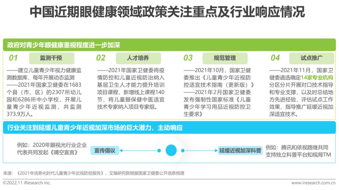 近年来,中国儿童青少年近视呈现高发、低龄化趋势。2021年,中国儿童青少年近视的患病率已超60%,预计未来在全人口中至少有9.6亿近视人口。延缓儿童青少年近视加深也将成为国家卫健事业发展的一项重要任务,当前,中国基本形成了“政府主导,部门协作,医技支撑,学校主体,学生中心,家庭协同,社会聚力”的延缓儿童青少年近视加深中国模式,并在“十四五”时期出台了系列儿童青少年眼健康规范引导政策指南,系统化、具象化部署延缓儿童青少年近视加深工作。