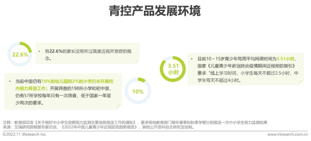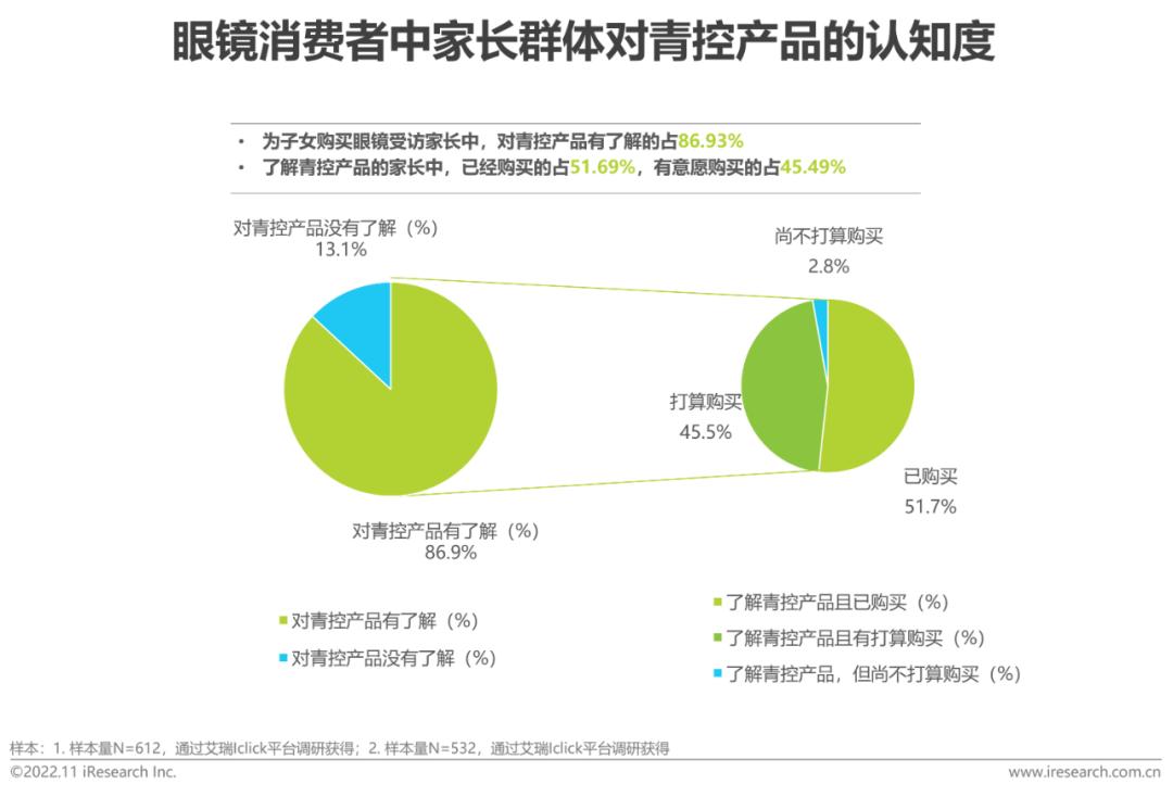 随着数智技术的发展和消费电子的不断渗透,中国未成年人首次触网年龄前置化明显,3-10岁及以下开始接触互联网的人数比例已达到75.8%,首次触网的主要年龄段集中在6至10岁;加之疫情时代下,学生线上课增加也进一步加重儿童青少年用眼压力,过度使用电子产品、课业压力大、户外运动少是影响儿童青少年眼健康的主要原因,在此背景下,家长群体对青控产品的认知度和购买意愿呈现双提升态势,艾瑞调研结果显示,为子女购买过眼镜的家长中对青控产品有了解的占86.93%,其中超过半数家长已经为子女购买了青控产品。