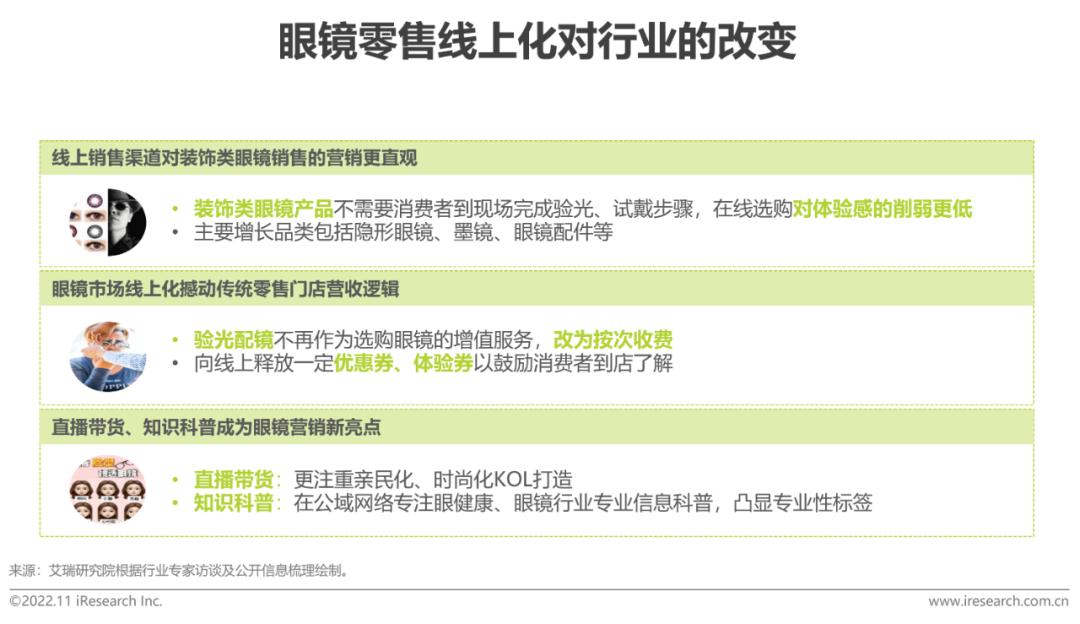 疫情对传统零售行业的消费形式预期还将持续带来新冲击,近期一批传统眼镜行业厂商及零售品牌正面向线上化寻求转型,在转型过程中,较容易实现线上推广营收的眼镜品类主要为隐形眼镜、彩瞳、平光太阳镜等不需要消费者现场验光试戴的产品;对于验配技术要求相对较高的视力矫正类框架眼镜,业界普遍认为线上渠道难以对其造成实质性冲击,但当前市场也有一定线上化探索,如一些零售品牌将传统眼镜定价模式中的验光服务按次收费,或通过线上销售优惠券、体验券的模式鼓励消费者到店了解选购眼镜产品,以及通过直播带货、专业科普增加品牌曝光率等。