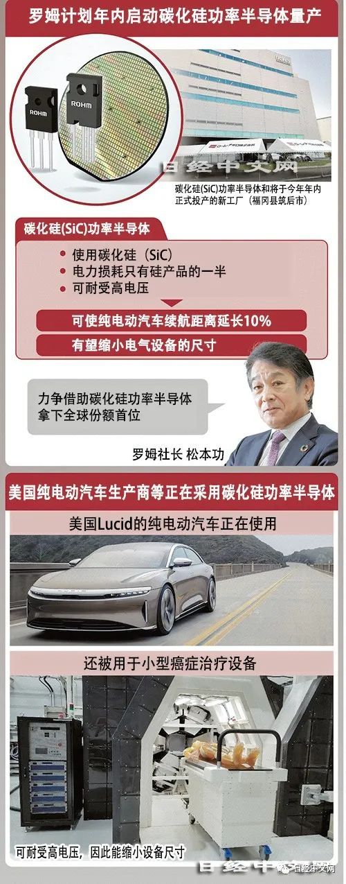 罗姆2022年4月发布消息称,美国新兴纯电动汽车制造商Lucid Group的车辆已确定采用该公司的产品。松本社长表示“目前还在以日本和欧洲厂商采用我们的产品为目标进行协商”。2021年,罗姆与中国大型汽车零部件企业“正海集团”(山东省)成立了合资公司。最早将于今年年内开始生产使用碳化硅的电流转换零部件等,向中国汽车制造商供货。