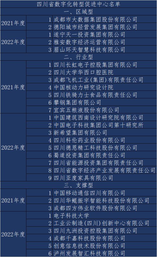 2021年认定的省级数字化转型促进中心有:成都市大数据集团股份有限公司、德阳城市经营发展集团有限公司、四川长虹电子控股集团有限公司、四川大学华西口腔医院、成都飞机工业(集团)有限责任公司、中国核动力研究设计院、四川铁骑力士食品有限责任公司、攀钢集团有限公司、宜宾五粮液股份有限公司、中国移动通信集团四川有限公司、成都四方伟业软件股份有限公司、四川华鲲振宇智能科技股份有限责任公司。