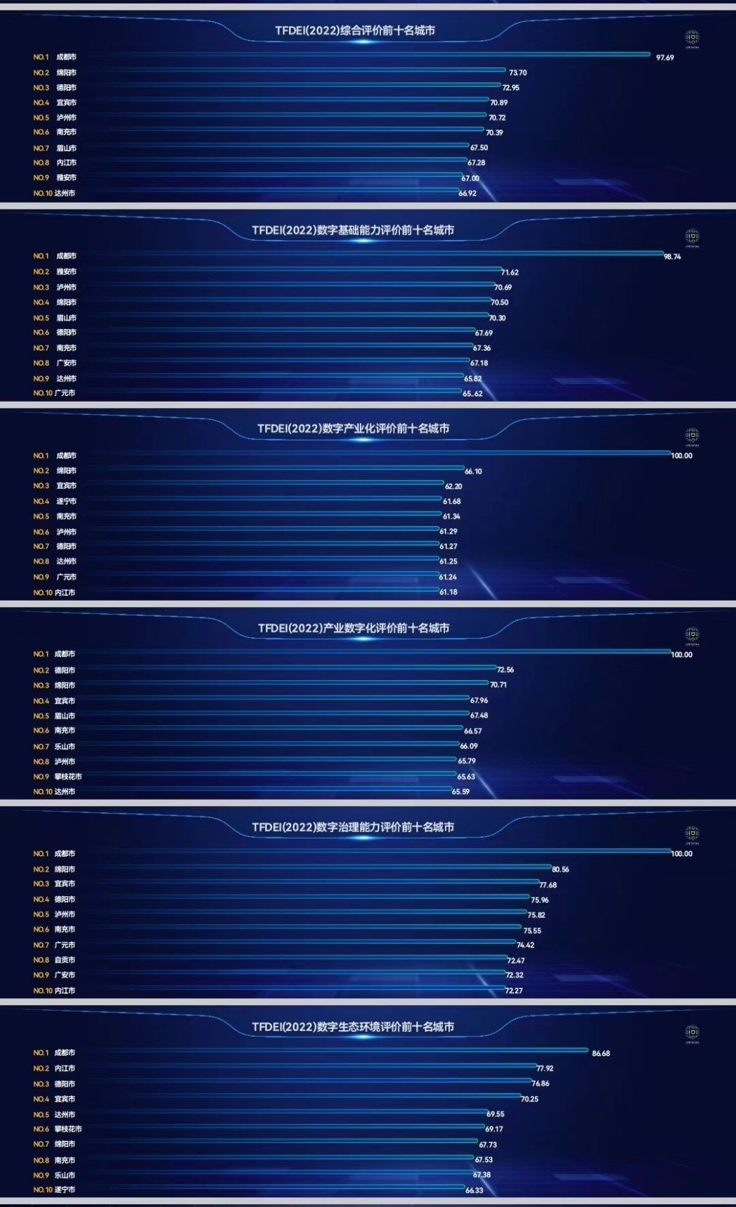 综合评价排名中,成都市排名第一,绵阳市、德阳市位居第二、三。具体而言,数字基础能力方面,成都市、雅安市、泸州市位居前三;数字产业化方面,成都市、绵阳市、宜宾市位居前三;产业数字化方面,成都市、德阳市、绵阳市位居前三;数字化治理能力方面,成都市、绵阳市、宜宾市位居前三;数字生态方面,成都市、内江市、德阳市位居前三。