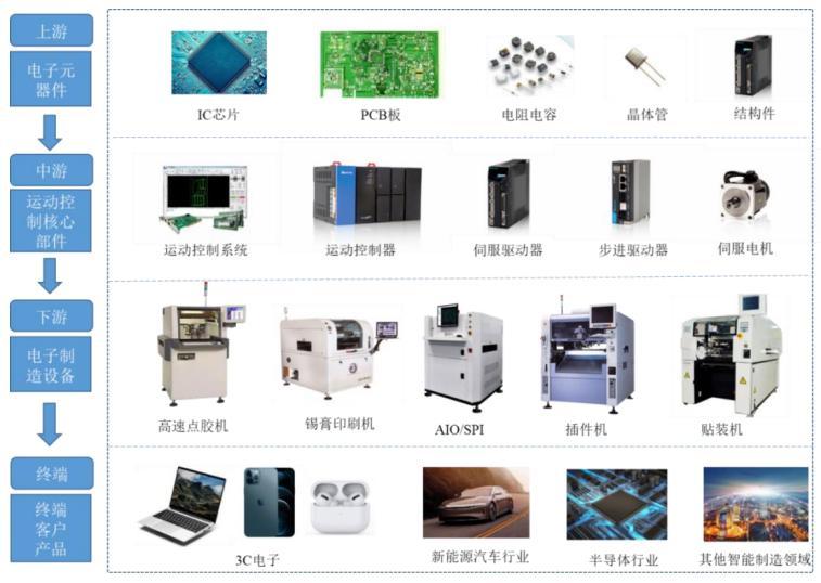 从行业产业链来看,公司所处行业上游包括硬件(电子元器件/机械结构件)和软件(编程开发工具/操作系统)等;中游核心部件包括运动控制器、伺服驱动器、伺服电机等;下游包括点胶机、锡膏印刷机、自动光学检测设备、贴装机、插件机等电子制造设备厂商。公司属于产业链中游。